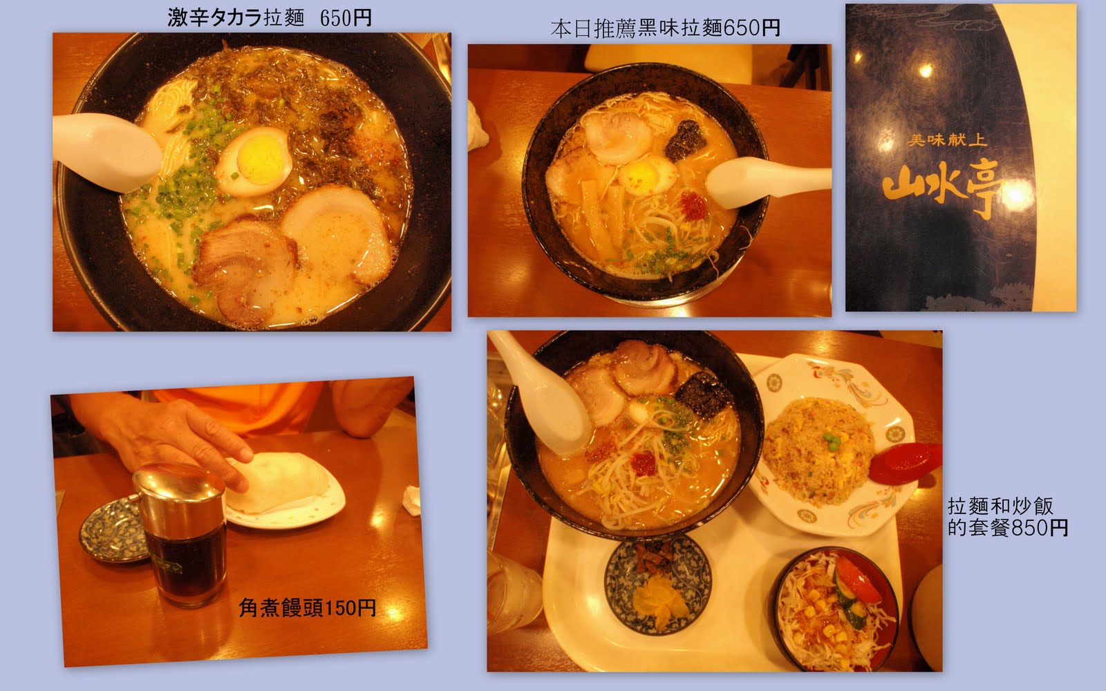 我們隨意找了間拉麵店山水亭吃。熊本的名物不完全是拉麵,最有名的是太平燕(冬粉,歷女一書說紅蘭亭不錯),再來就是馬肉刺身,之後去了阿蘇有吃到馬肉刺身。山水亭的麵條似乎比博多一風堂的麵細,拉麵麵條越細,夾帶湯汁會越飽滿,吃起來會比較滋潤一點,湯頭也以豚骨為湯底,濃郁帶甜-應是蔬菜較多,價格經濟實惠。可愛的是有搭配炒飯的拉麵套餐,炒飯的功力也算到位-雖然我覺得有點油。店內還有販賣台灣粽子和肉包(長崎的岩崎本舖較油、好吃)。